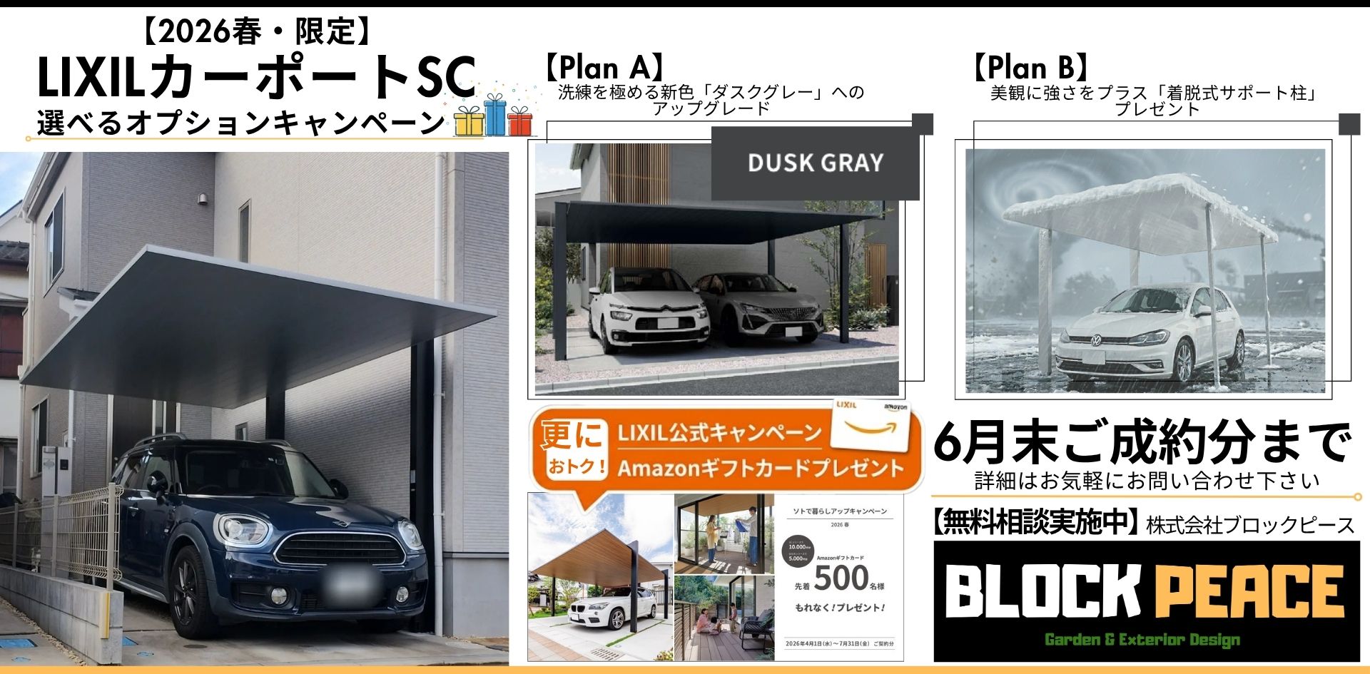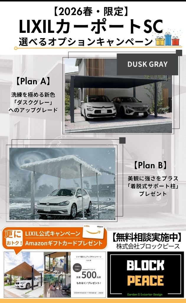 ブロックピースの「オプションキャンペーン」に加えて、今ならLIXILからも嬉しいギフトが届きます。カーポートSC のご成約で、Amazonギフトカード 10,000円分がもらえます。