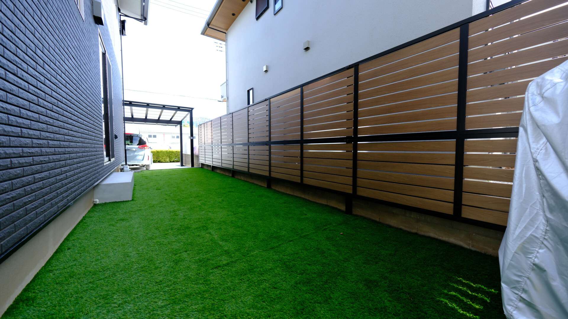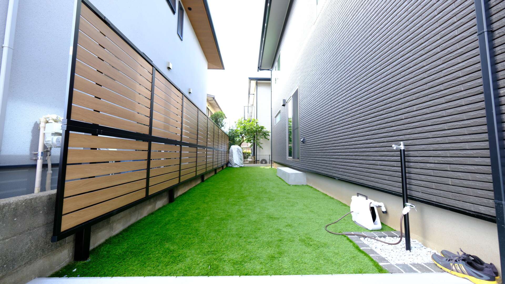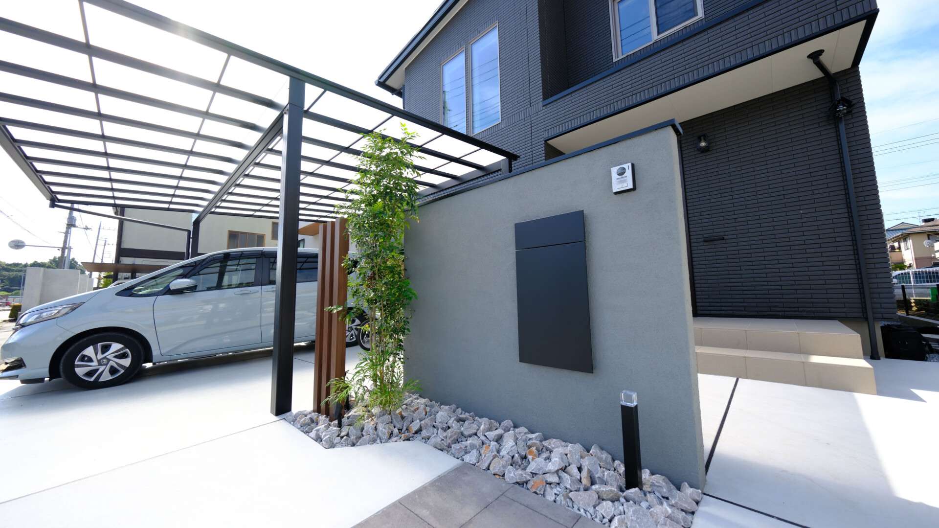 YS3 フーゴ 木の棒 宅配ボックス埋め込み 柱移動 導線スムーズ 人口芝 大きな自然石 エクレル アクアルージュ ローメンテ 一条 かっこよく どうしたらいいかわからない シンプルかつモダン、ロックガーデン、駐輪場兼