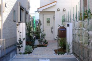 建物や自転車置き場などに向かう動線にはランダムに飛び石が配置され、歩幅に合わない割付や凹凸などで歩きづらさを感じていて、特に雨の日は気を使っていたそうです。