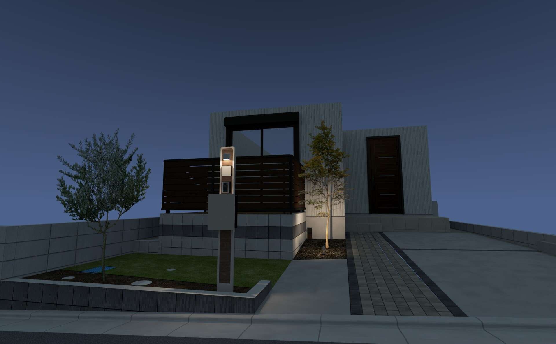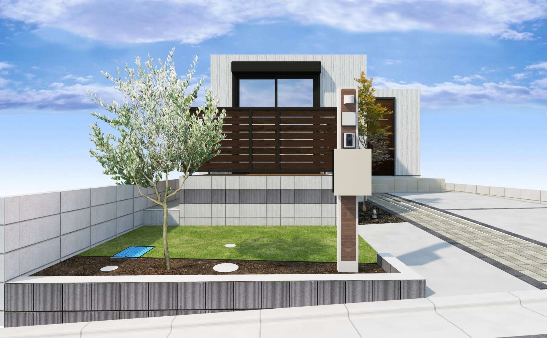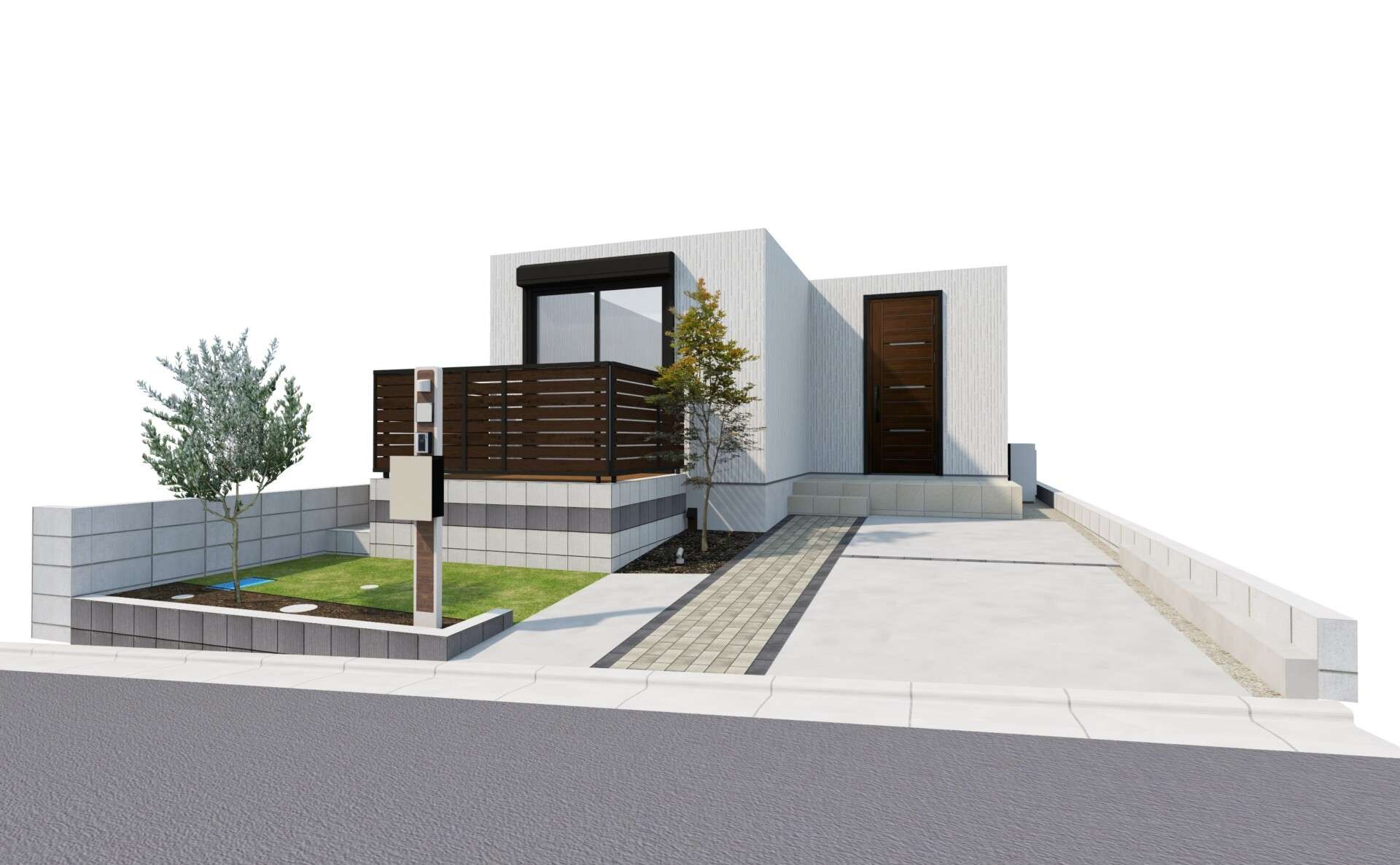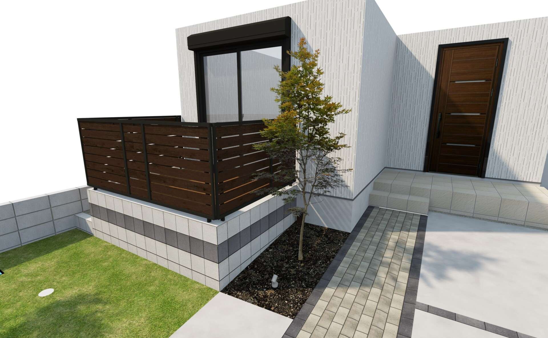 モダンなブロックと、おしゃれな目隠しフェンスで囲まれたウッドデッキを中心に、アプローチや駐車場、庭などを機能的にコンパクトに提案させて頂きました。