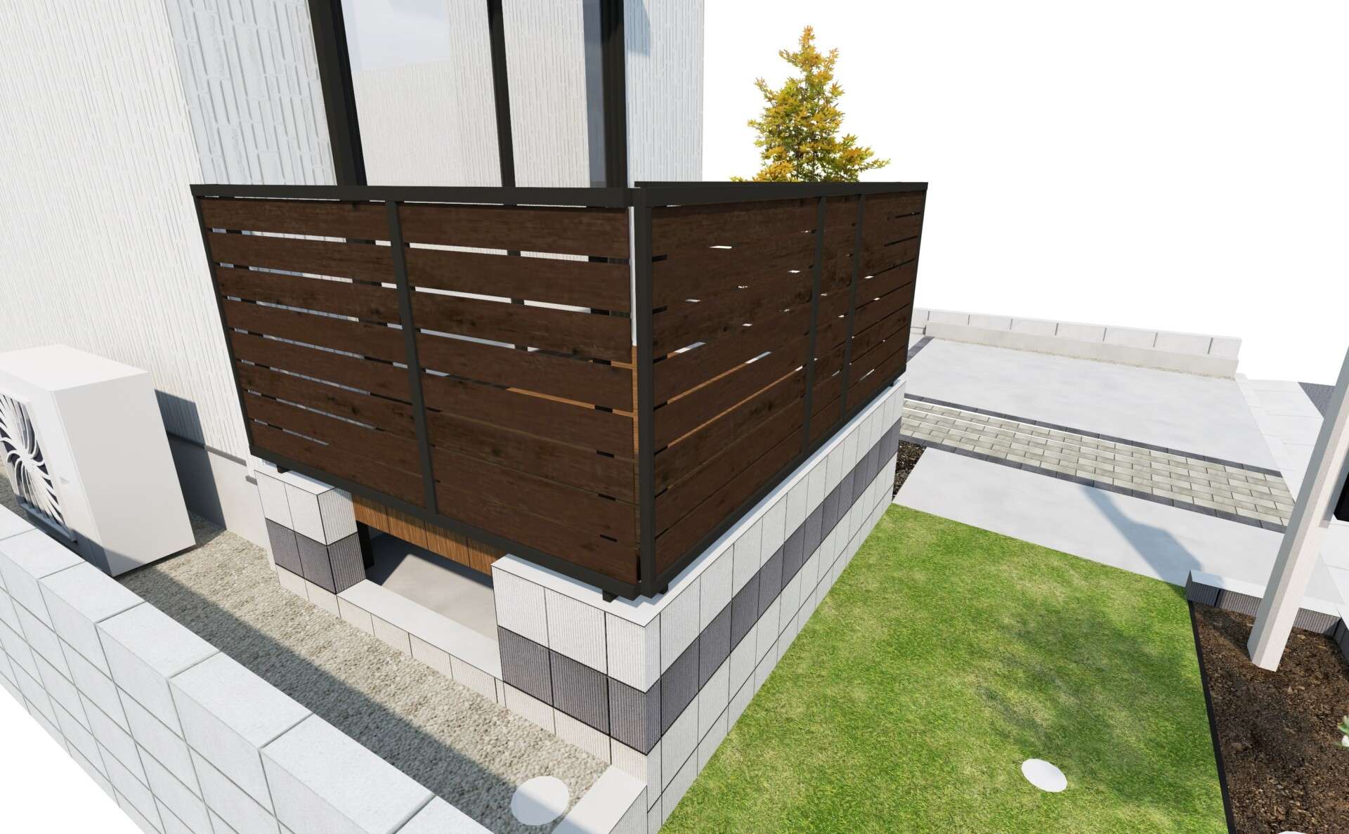 その上に木調の目隠しフェンス(LIXILフェンスAB、YS3型)を取り付ける事でプライバシーと美観を確保しました。
