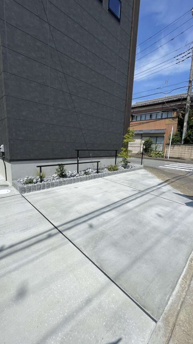 駐車スペースとアプローチには土間コンクリートを打設し、雨の日の出入りや車の出し入れ、雑草対策などの機能性はしっかり確保。