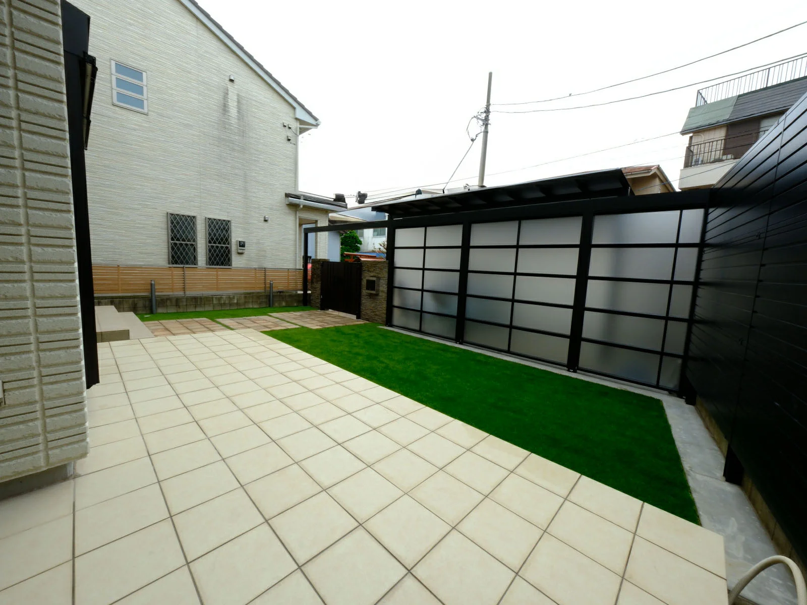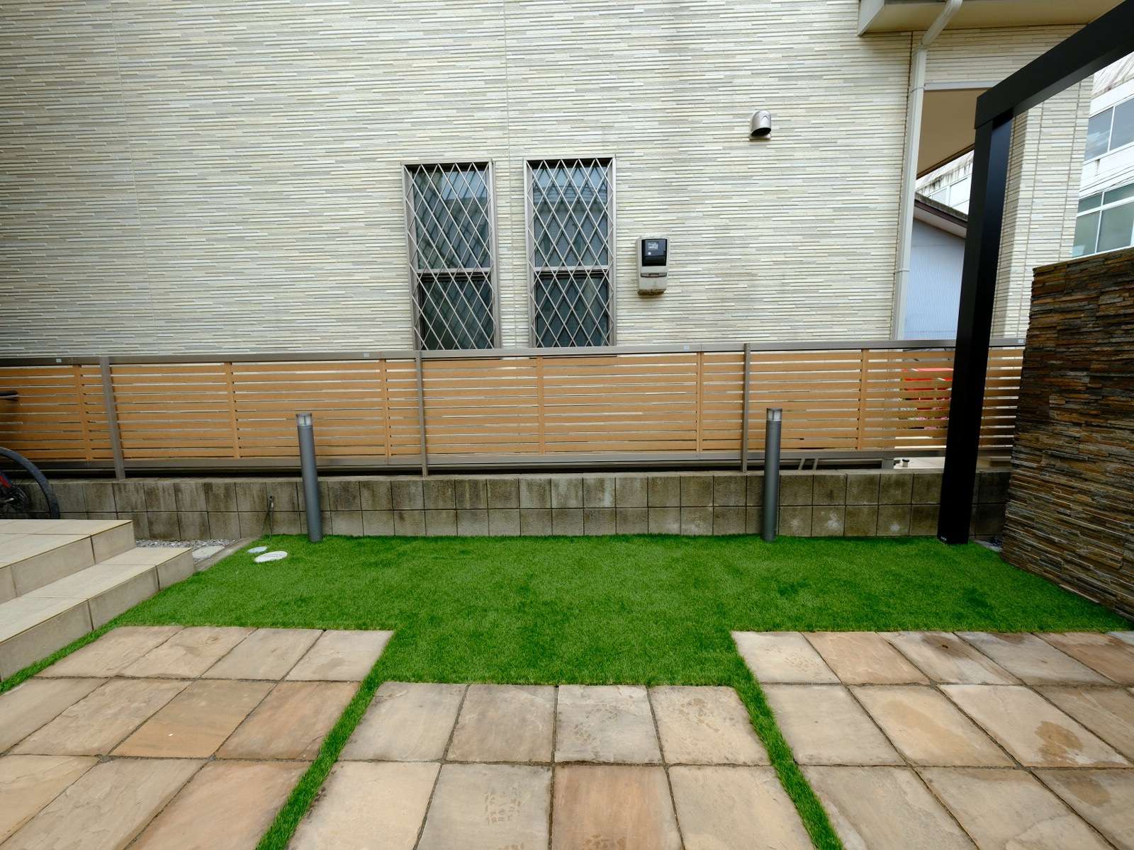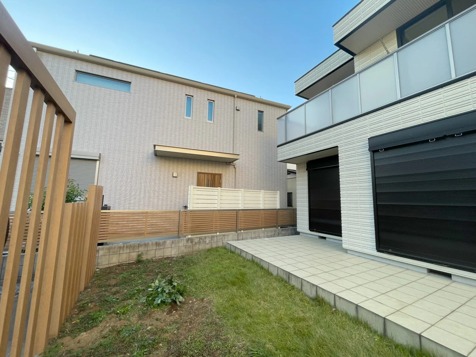 隣地との境界にはより目隠し効果の高い、アルミ多段柱を用いた3段張りの背の高い完全目隠しフェンスを張ることで、よりプライバシーを高めています。