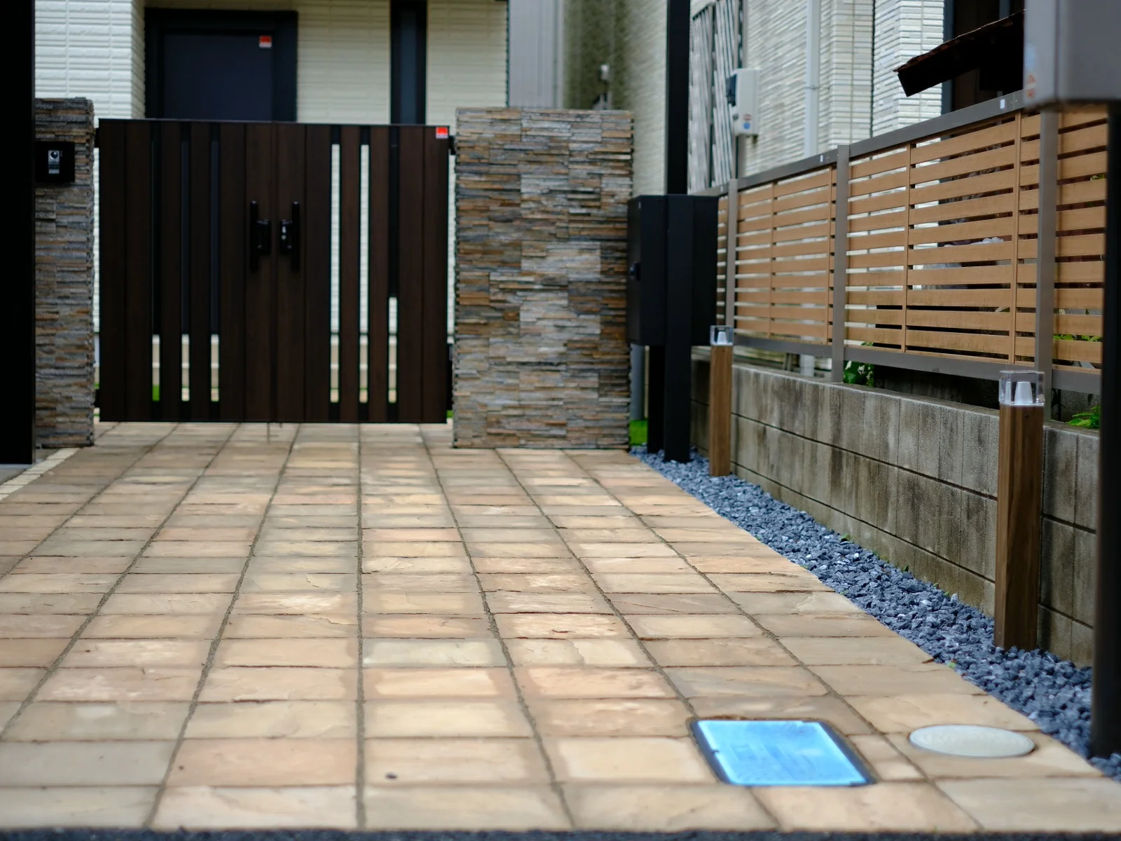 門柱は既存のものを利用して予算をおさえながらも、据え置き型の宅配ボックスを新たに設置することで利便性を高めています。